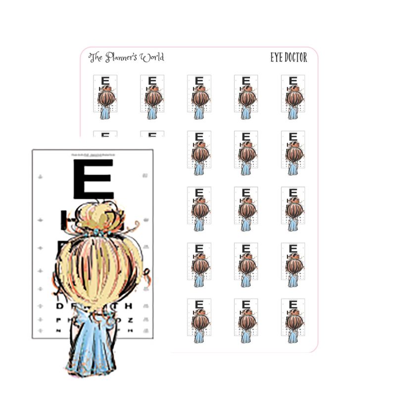 This is a set of stickers that can be used to mark Eye Doctor appointments in a planner, calendar or bullet journal.  They feature the back of a girls head with an eye chart in front of her.  What a cute reminder these stickers will make.